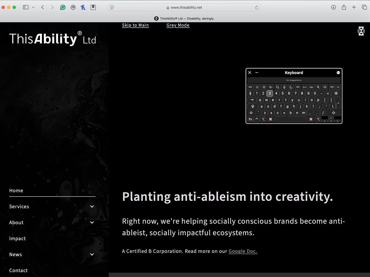 This is not an accessibility statement solely for compliance. This website was a collaboration between myself for ThisAbility® Limited and Disabled designer Jessica Oddi. It was developed with the core belief that Access is Love — the incredible project by Alice Wong, Mia Mingus, and Sandy Ho.